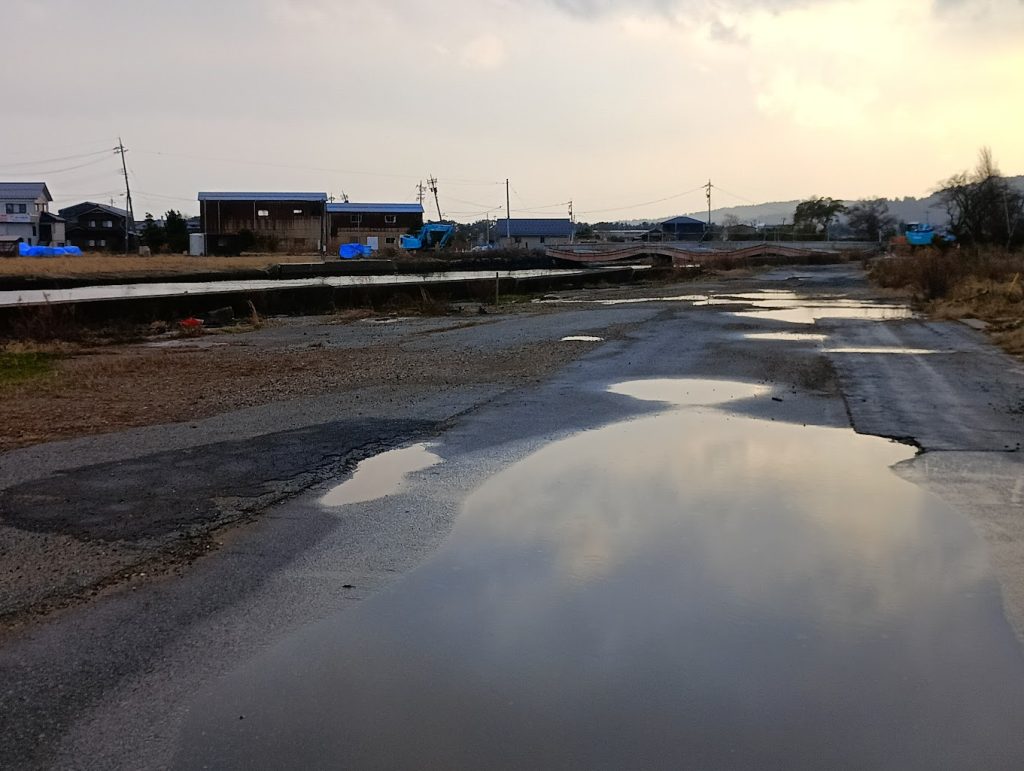 写真ではわかりずらいですが、道路がかなり陥没しています。水たまりがそれを表してます。